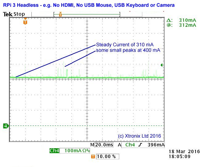 The above figures are 'typical. They are measured on one example of each configuration using a Tektronix Digital oscilloscope with a Tektronix current probe. The operating system on each PCB (except the RPi 3 Model B+) was Raspian from NOOBS 1.8. Raspian GNU/LINUX 9 was running on the RPi 3 Model B+.